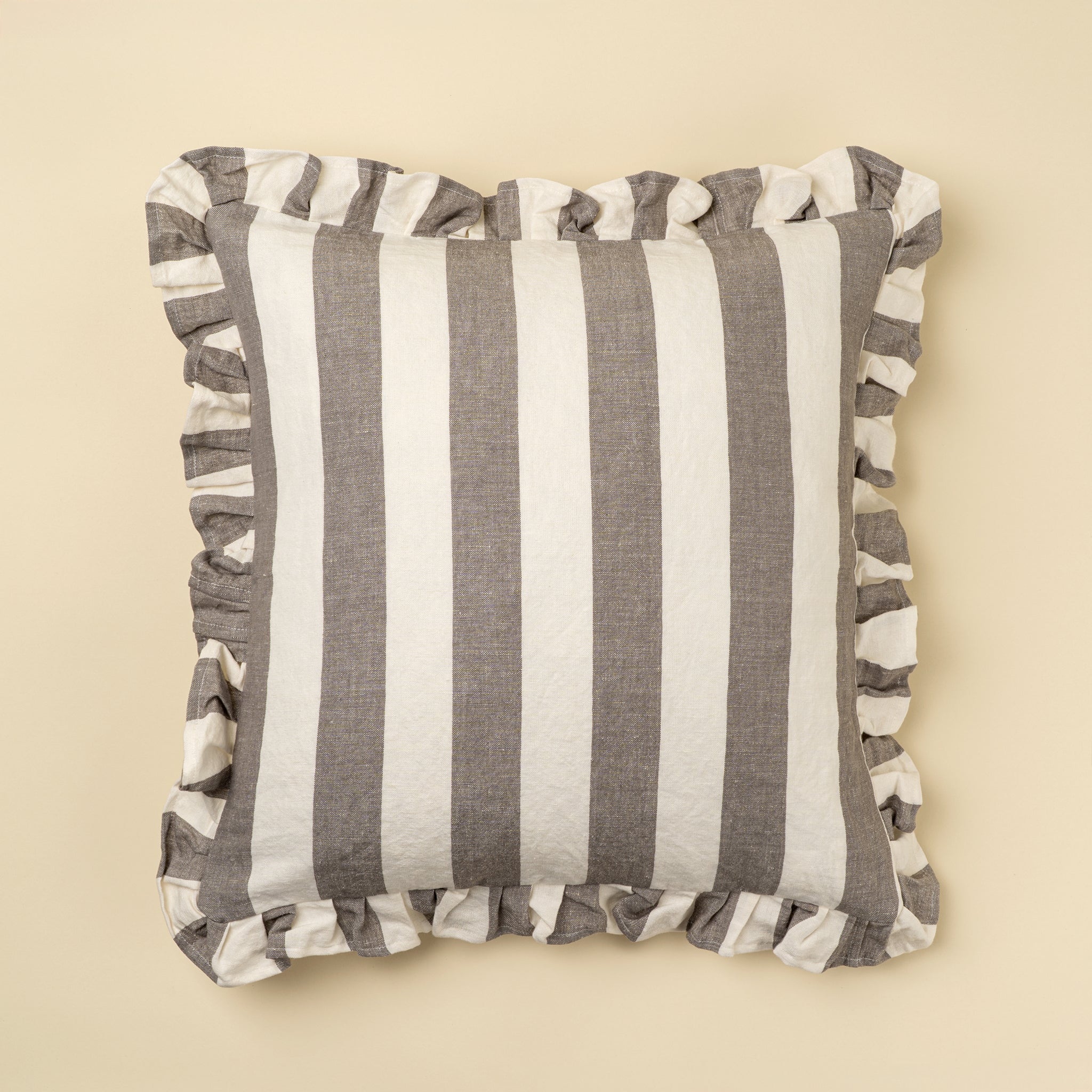 Add a playful yet polished accent to your home with the Ruffle Thick Stripe Pillow. Handmade from a 50% linen, 50% cotton blend, this pillow pairs classic stripes with a soft ruffle border for a timeless French cottage feel. Wide, neutral stripes bring relaxed elegance, while the ruffled trim adds a cozy touch to your bedroom or living room decor.