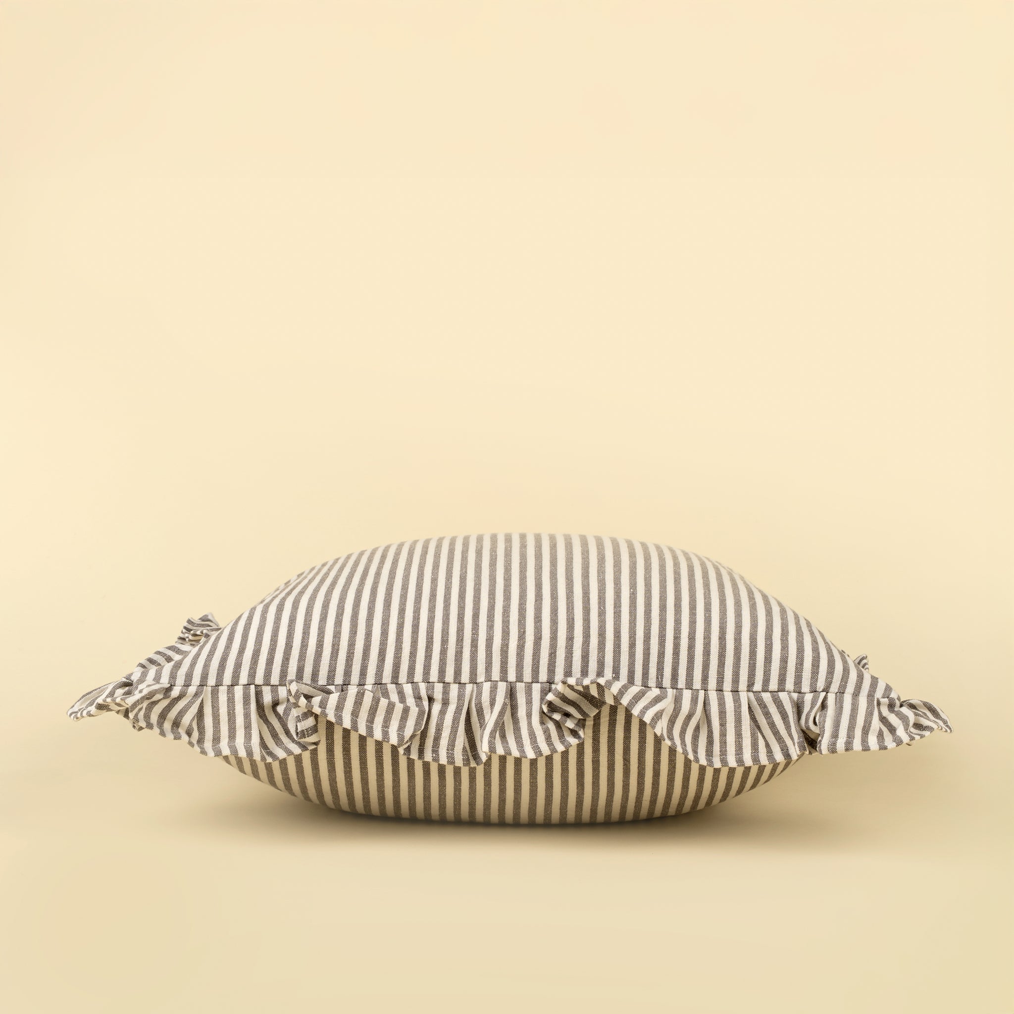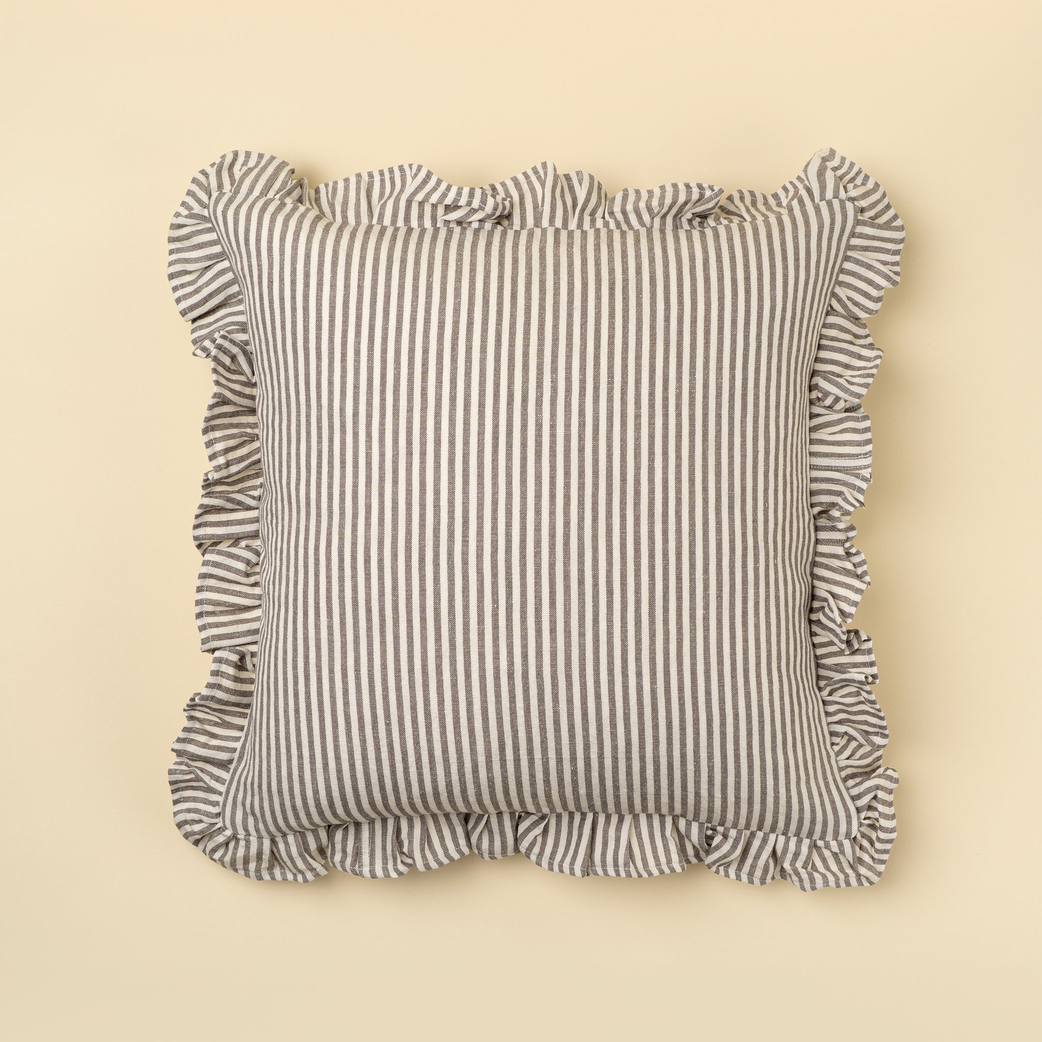 Add light and texture to your home with the Ruffle Thin Stripe Pillow. Handmade from a 50% linen, 50% cotton blend, this throw pillow pairs classic thin stripes with a soft ruffle border for a timeless French cottage feel. Its neutral palette makes it easy to mix and match with other pillow covers or layer onto your bedroom pillowscape for a look that’s both polished and relaxed.