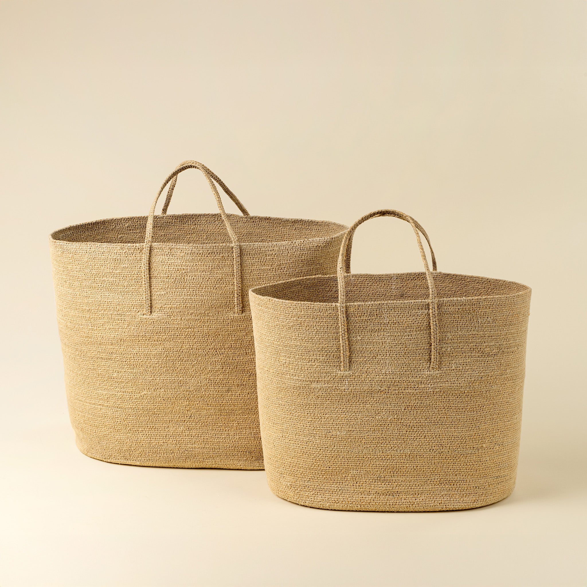 A stylish storage solution that blends beauty and function, the Natura Seagrass Baskets are handcrafted using traditional methods and durable seagrass with visible overstitching. This nesting set of two brings warm, natural texture to any room while offering practical storage for blankets, pillows, or everyday clutter. Artisan-made and grand in scale, they add charm and versatility to your accent decor while embodying sustainable craftsmanship.