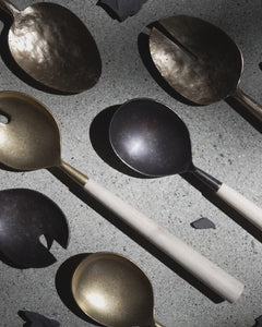 Featuring timeless design, these tumbled gold salad servers are hand-forged in India and bring textural warmth to any dining occasion with their natural maple wood handles. Beautifully gift boxed, they make welcome hostess gifts. Hand wash recommended.
