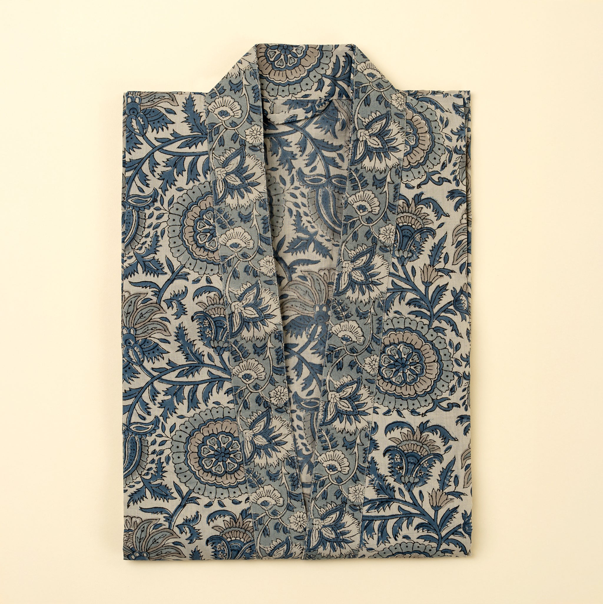Wrap yourself in the relaxed luxury of the Capri Block Print Kimono. Made from lightweight cotton and hand printed using traditional block printing methods, this easy-fitting robe features a flowing silhouette and a floral motif in soft, cool blue tones. Whether worn while lounging at home or styled over a simple outfit, its natural drape and artisan-crafted pattern add comfort and character to your daily rituals. With wide sleeves and a self-tie belt, it’s a versatile piece that brings handcrafted beauty to your everyday wardrobe.