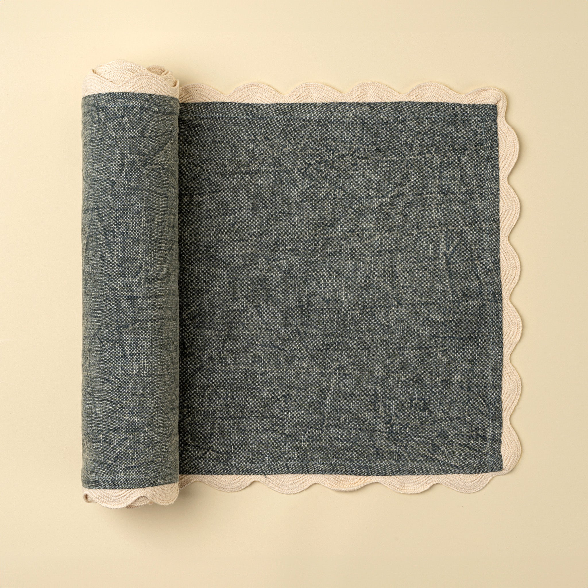 Bring charm and texture to your dining space with the Rick Rack Table Runner in Blue. Made from a soft linen-cotton blend, this 108" handcrafted piece is ideal for setting the table with thoughtful, layered accents. The relaxed blue fabric is framed with delicate natural-tone rickrack trim, offering a soft contrast and a feminine finish. Sized for long or farmhouse tables, it’s perfect for both everyday dining and special occasions. Whether styled alone or layered with other handcrafted products, it adds effortless elegance to your accent decor.
