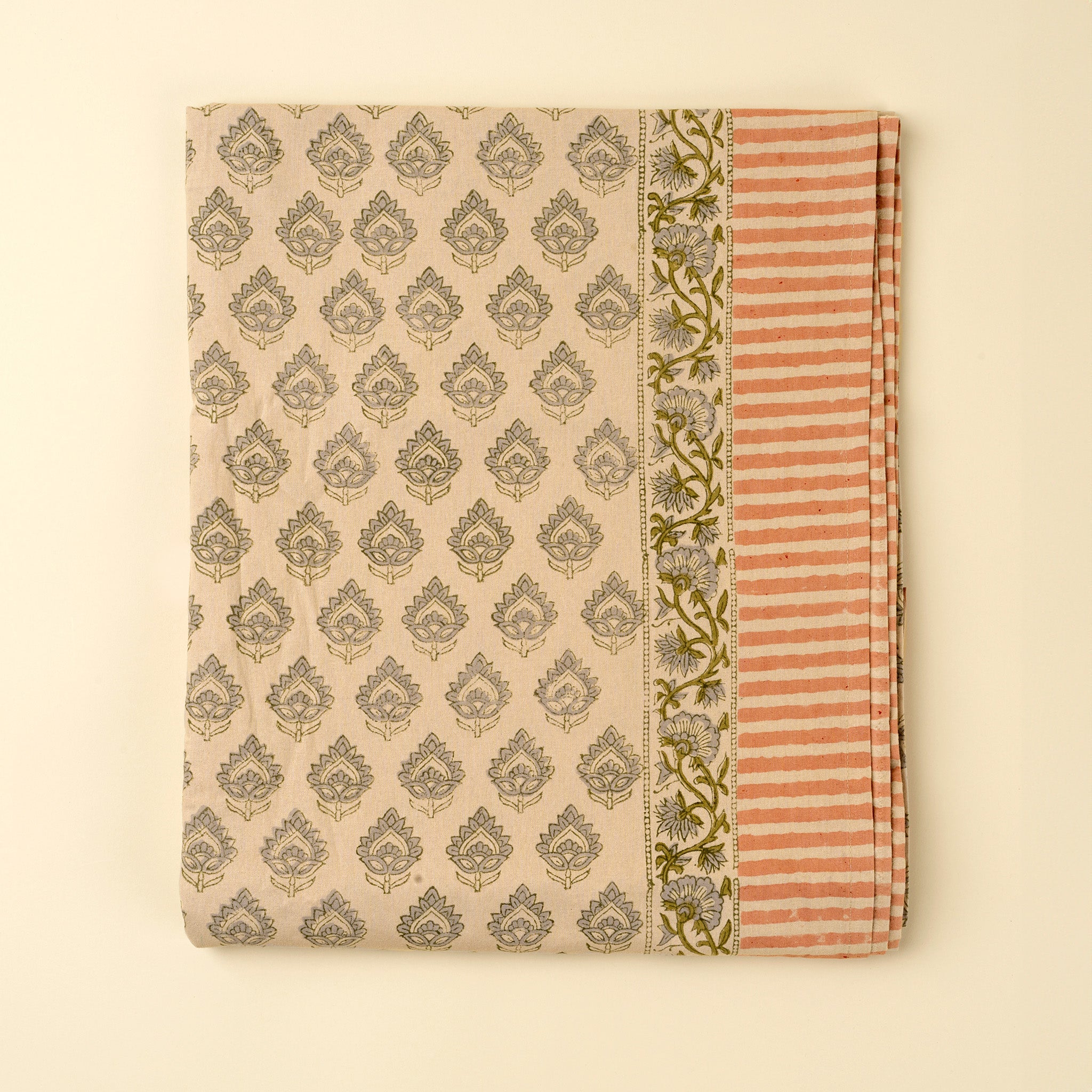 Infuse your dining space with pattern and warmth using the Ritika Block Print Tablecloth. Made from 100% organic cotton and hand block printed in India by skilled artisans, it features a traditional floral repeat pattern softened by muted tones and accented by a striped and vine border. Designed to suit harvest-style tables, it brings a touch of vintage elegance to both everyday meals and festive gatherings.