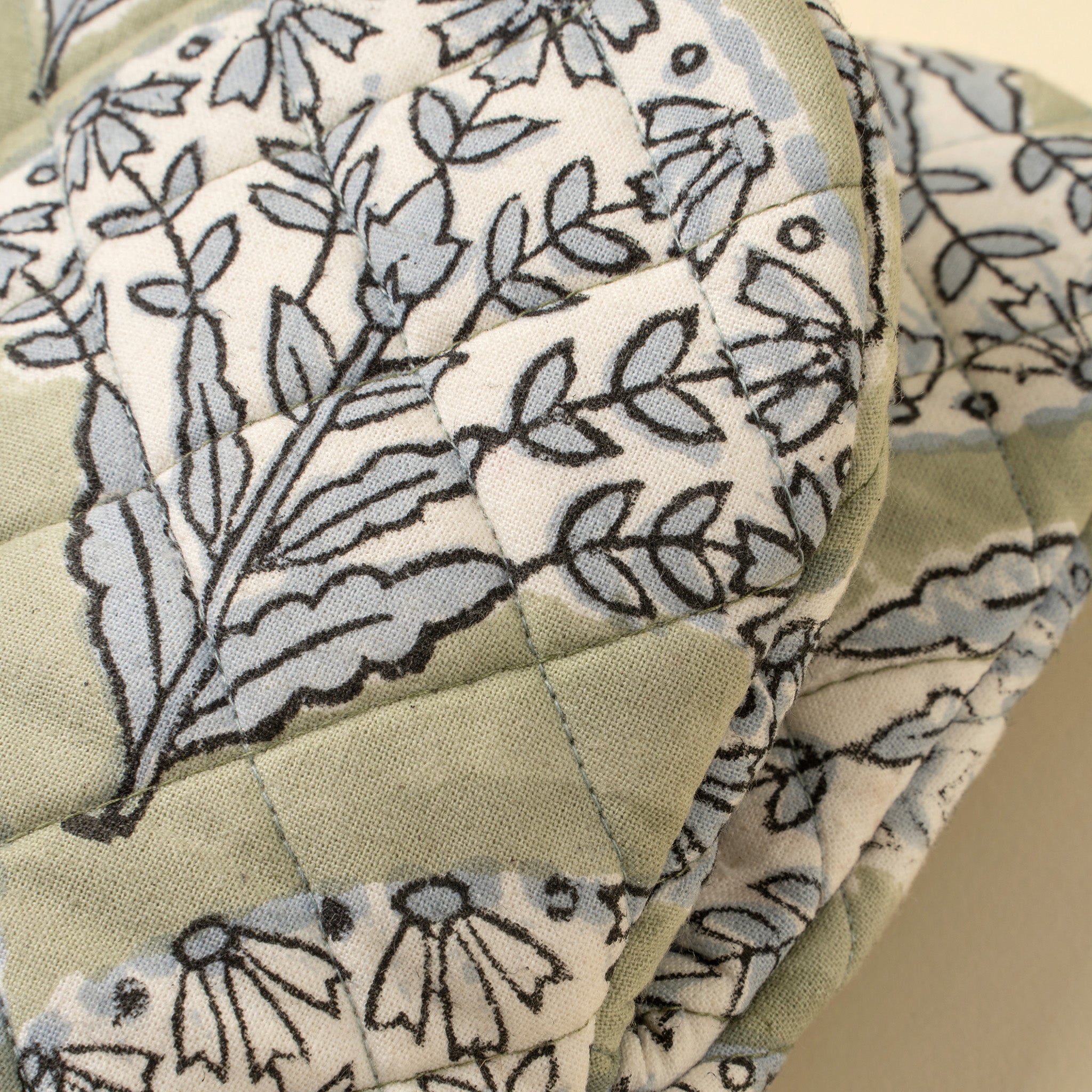 Add charm and practicality to your kitchen with the Sakura Block Print Oven Mitt. Made in India from 100% cotton, this artisan-crafted oven glove features a soft green base adorned with a fan-like pattern of floral sprays in muted blue, inspired by our traditional hand block printed designs. Its quilted texture, timeless silhouette, and easy-to-hang loop blend style and everyday functionality with ease.