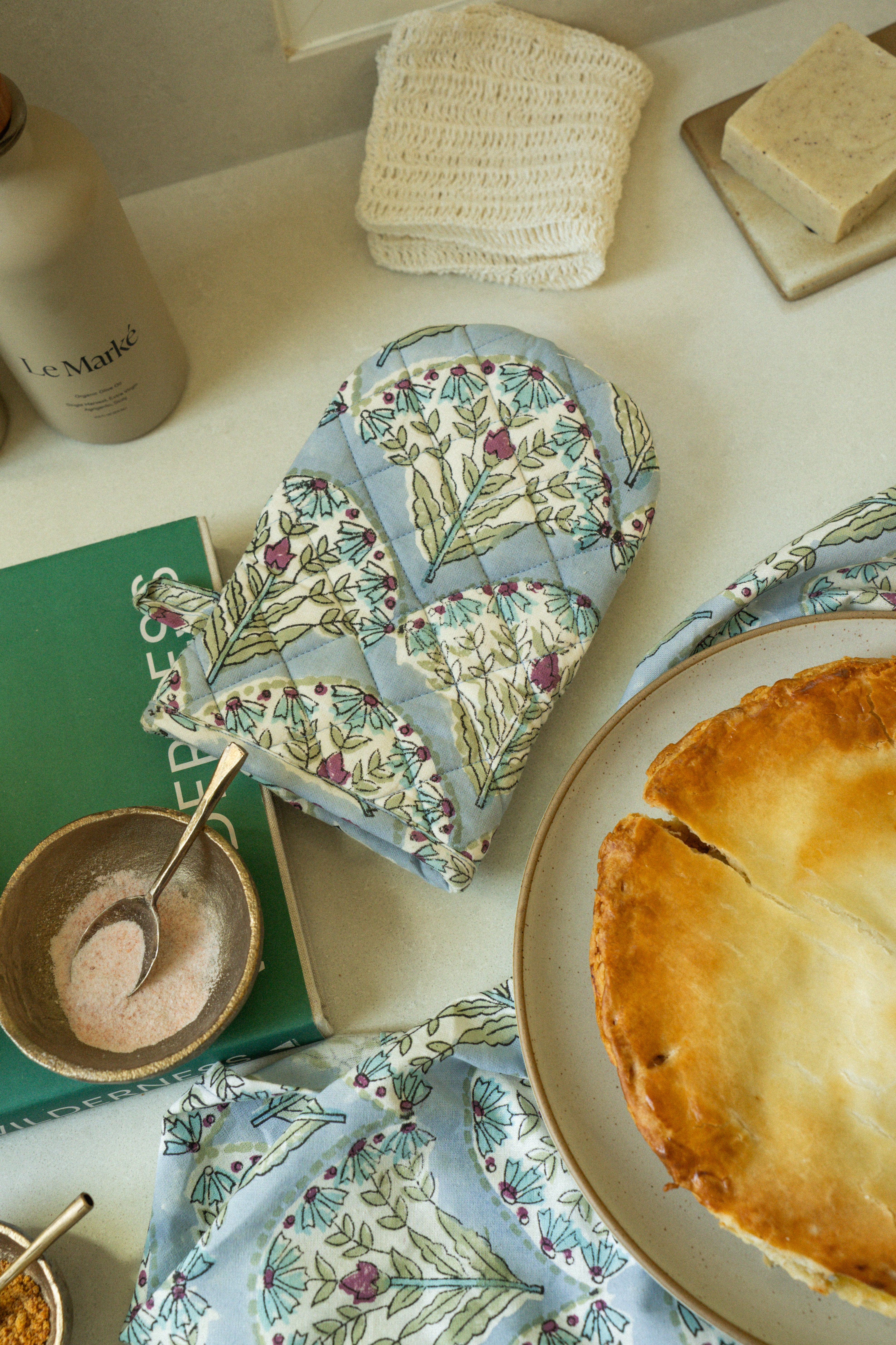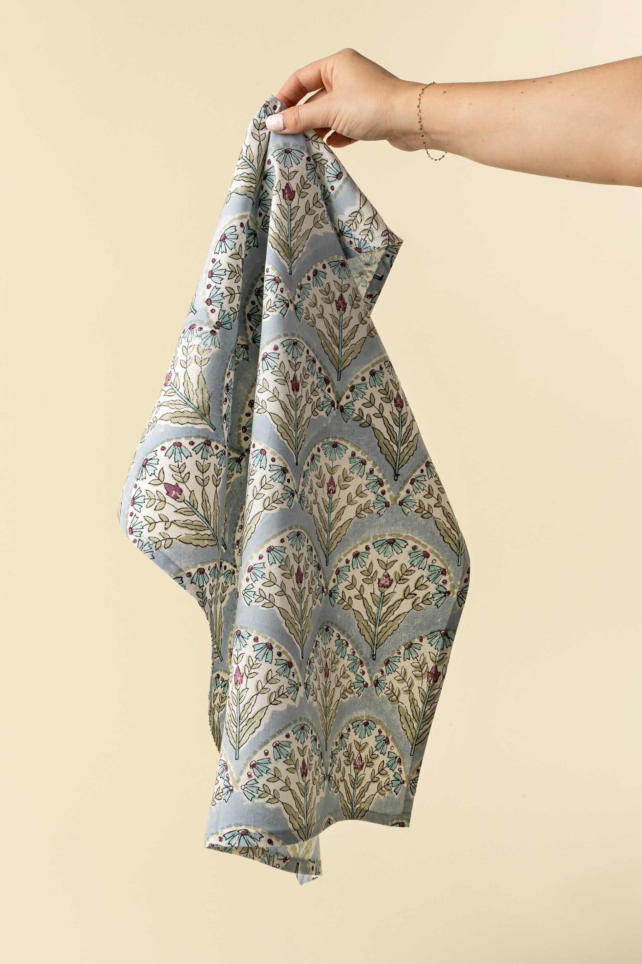 Add artisanal charm to your kitchen with the Sakura Block Print Tea Towels in Blue. Made in India from soft 100% cotton, this set of two features a fan-like floral pattern in blush and green tones set against a tranquil blue background. Each towel is hand block printed using traditional techniques, making every piece subtly unique. Lightweight and absorbent, they’re perfect for drying dishes, lining bread baskets, or hanging decoratively from a hook. These sustainable kitchen textiles blend form and function effortlessly.