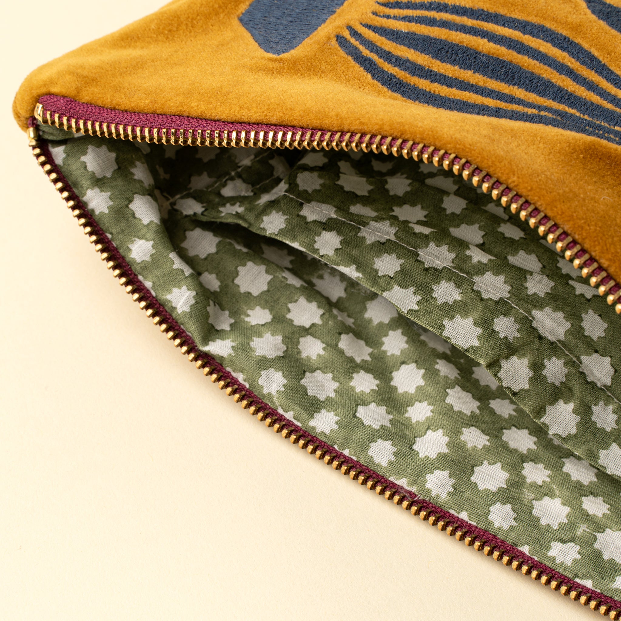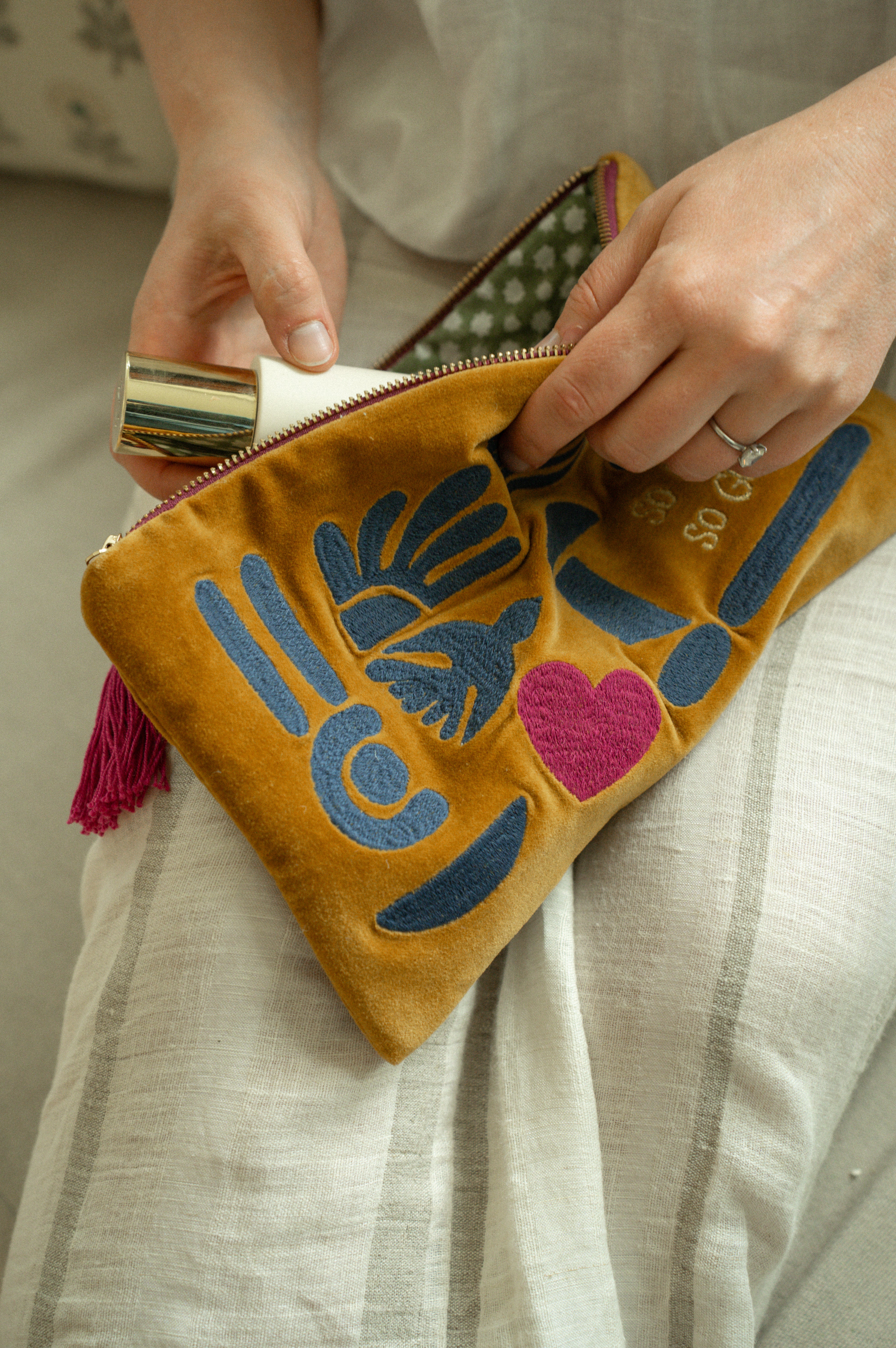 Add a little optimism to your everyday with the Spring Silhouettes Velvet Embroidered Pouch. Made from thick cotton velvet, it features bold embroidered shapes and the phrase “so far so good.” A soft tassel accents the sturdy YKK zipper, while the hand block printed lining and interior pocket offer thoughtful functionality and flair.