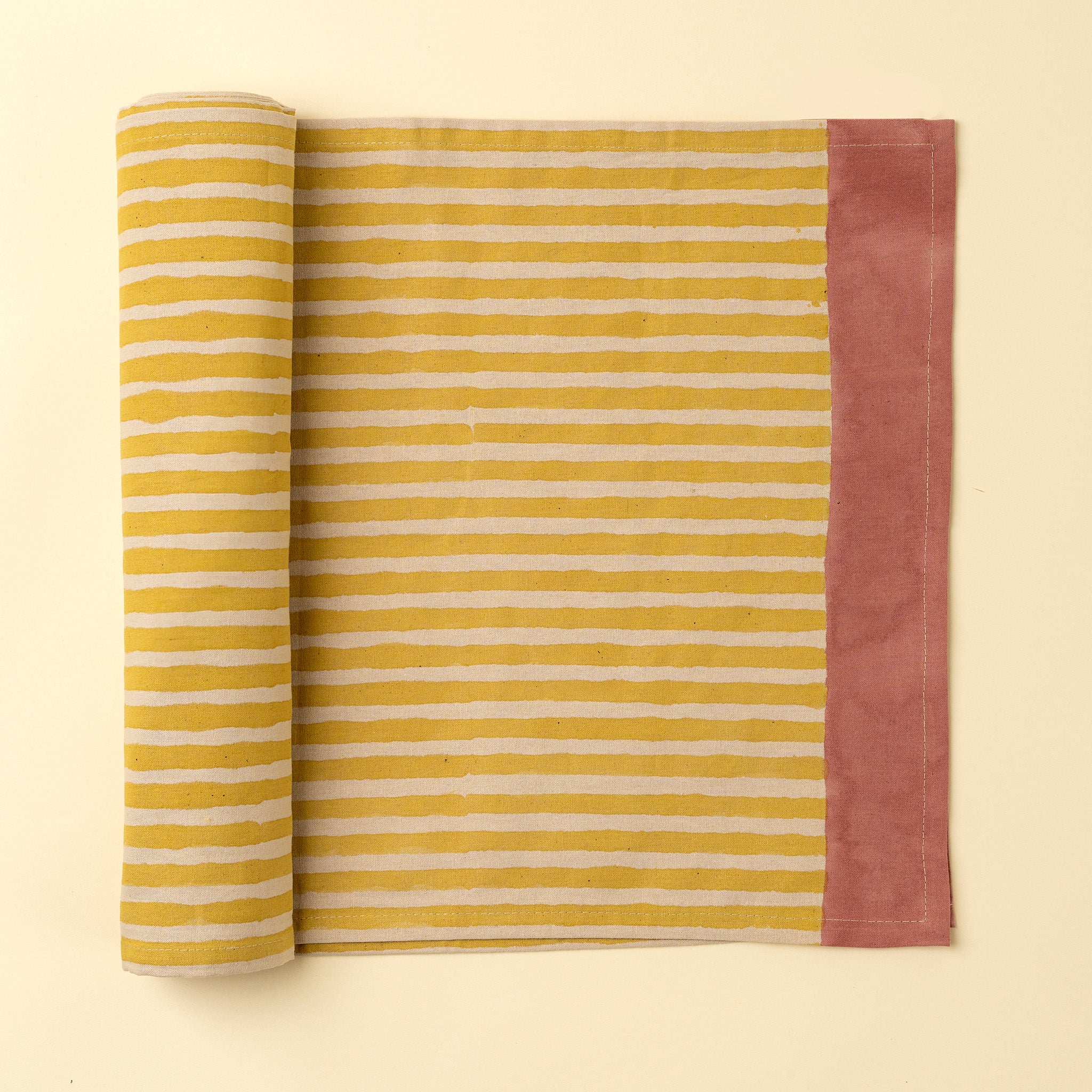 Brighten up your table with the Sun Stripe Block Print Table Runner, an artisan-crafted piece that brings charm and sustainability to your space. With its cheerful yellow stripes and muted rose-coloured border, this runner infuses your dining setup with a playful yet refined touch.