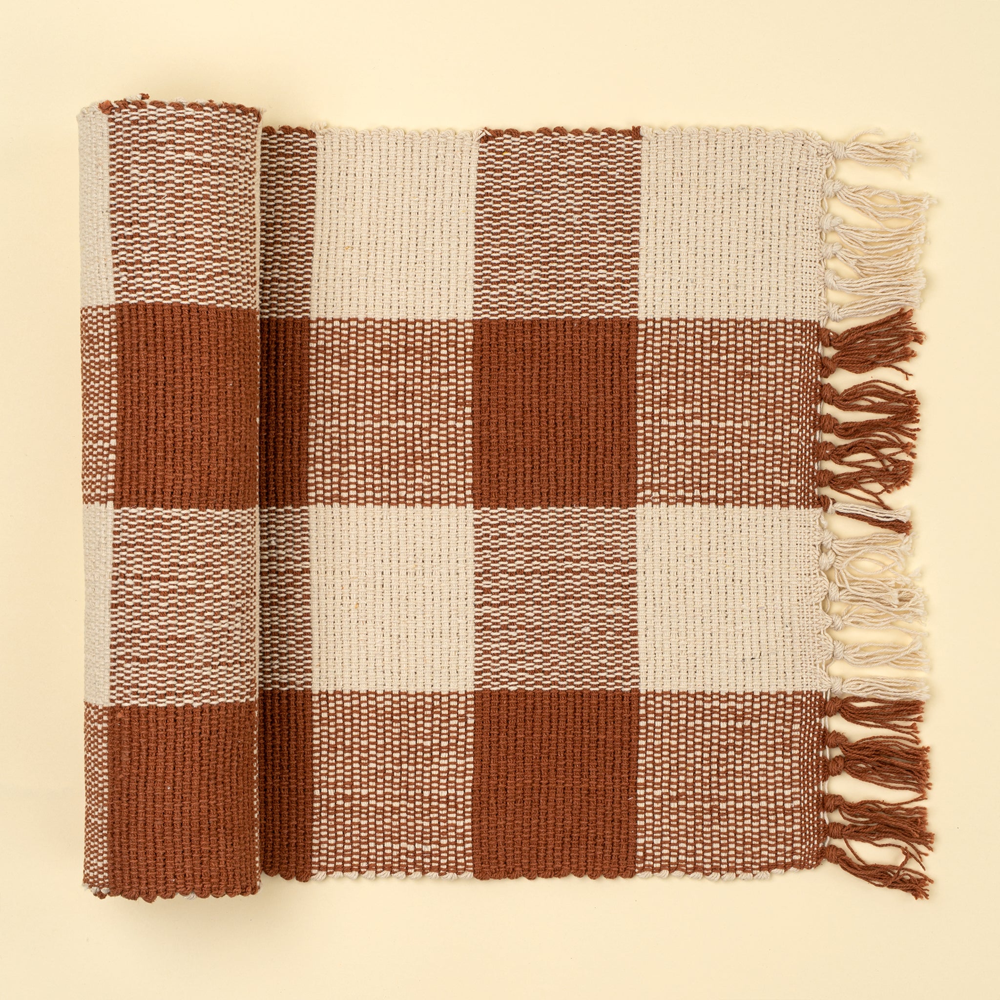 Materials & Composition: 100% cotton with tasseled edges and a gingham pattern.